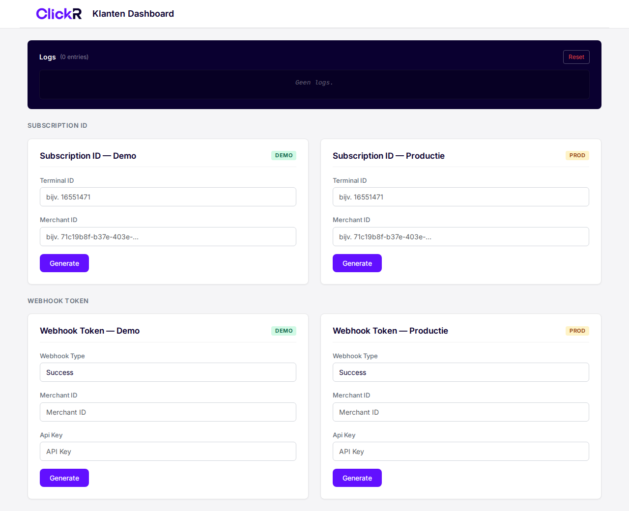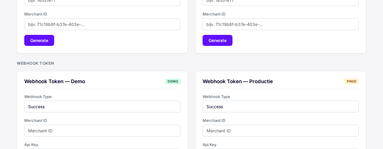 - In blok Webhook Token PRODUCTIE: vul Merchant ID en API Key in