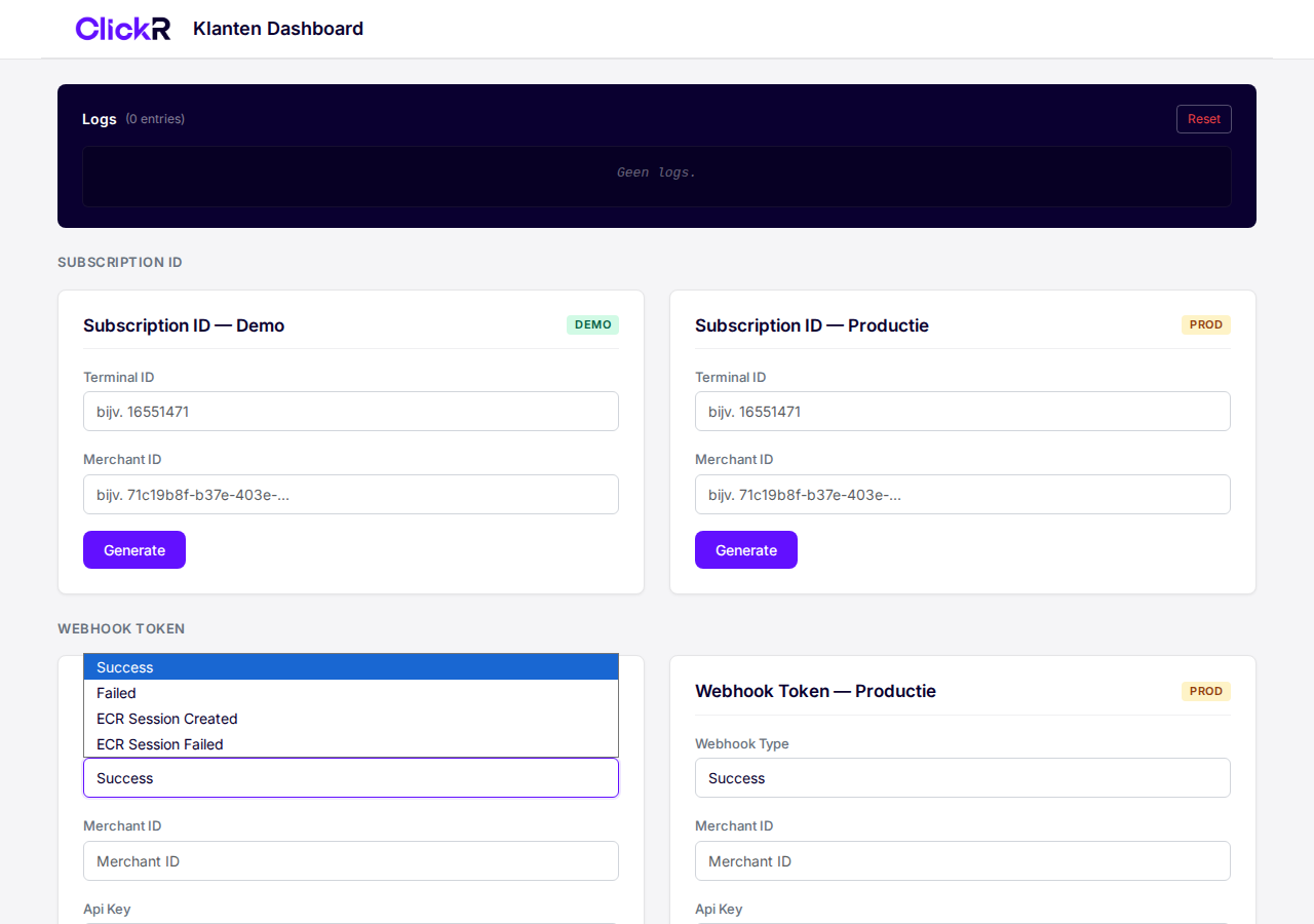 Webhook Type: kies eerst Success en klik Generate; herhaal daarna met Failed.